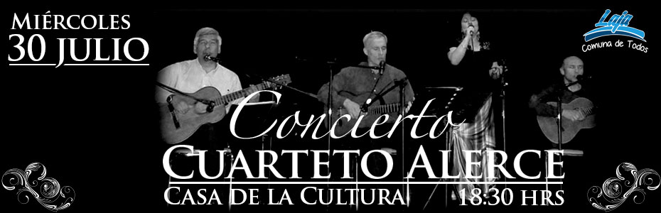 En su afán permanente de entregar cultura y entretención, el municipio de Laja ha organizado para el miércoles 30 de julio una clase magistral para folcloristas a cargo del grupo Alerce, entidad folclórica, oriunda de San Fernando en la sexta región, quienes traen a nuestra comuna música chilena en una versión elaborada que servirá a las agrupaciones folclóricas y público en general, para disfrutar y aprender de nuestro folclore.