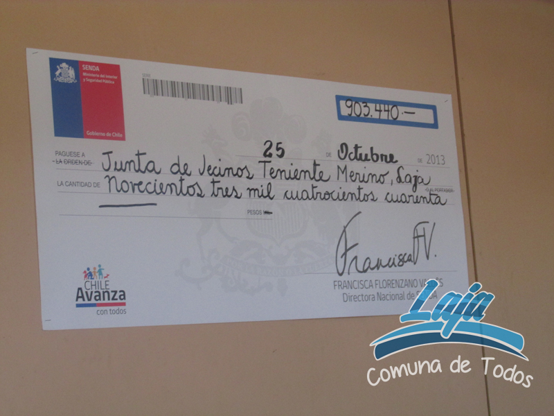La Junta de Vecinos Teniente Merino se adjudico la suma de $ 903.440.-, la de Altos del Laja sector 1 la suma de $ 819.740.-, las que se encuentran en plena ejecución y fueron inauguradas con la presencia del Alcalde de la Comuna sr. José Pinto Albornoz, Concejales, Dirigentes Vecinales y Directivos del área de Desarrollo comunitario municipal.