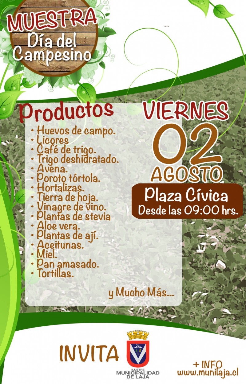La Ilustre Municipalidad de Laja a través de su área de Fomento Productivo y los Programas Prodesal, han organizado para el día viernes 2 de agosto entre las 9:00 y las 13:00 horas, una “Muestra Campesina”, en el marco de la celebración del Día del Campesino, actividad que se efectuará en la plaza cívica de la comuna.